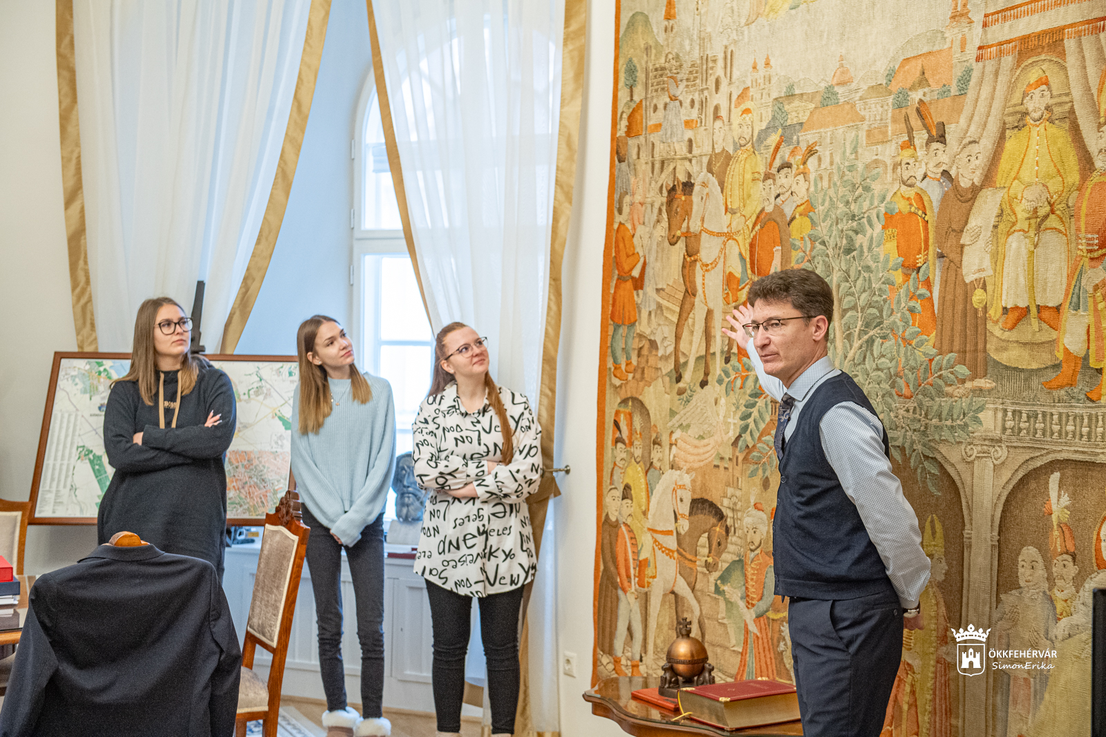 A köszöntő gondolatok után a polgármester bemutatta a hallgatóknak a Városháza Dísztermét, a koronázási ékszerek hiteles másolatait, valamint a polgármesteri irodát is.