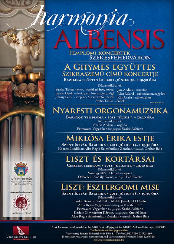 A Ghymes együttes koncertjével kezdődik június 30-án csütörtökön Székesfehérváron, a Harmonia Albensis - templomi koncertek - hagyományos hangversenysorozata. A nyitó koncertet - tekintettel a várható nagy érdeklődésre - a Szent István-bazilika előtti téren tartják meg, a többi hangversenynek viszont a belvárosi templomok adnak helyet.