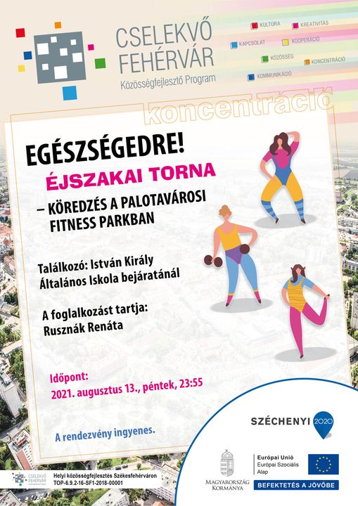 Pénteken, augusztus 13-án éjszaka Egészségedre! címmel Rusznák Renáta tart köredzést a palotavárosi fitness parkban. A torna résztvevői öt perccel éjfél előtt az István Király Általános Iskola bejáratánál találkoznak.