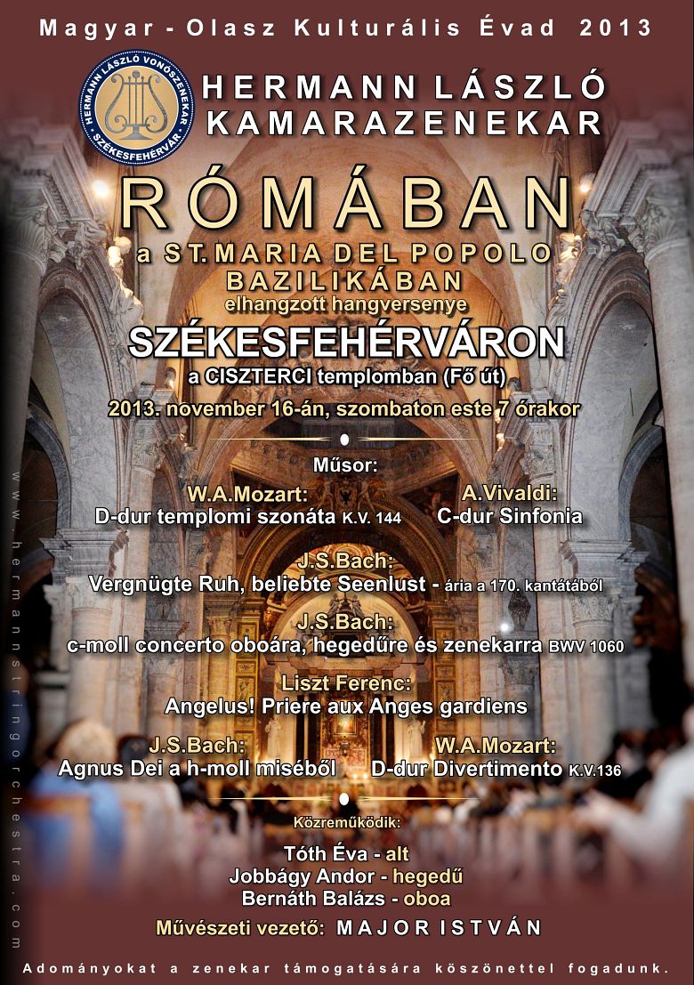 November 16-án, szombaton a Ciszterci Templomban adja elő a Hermann László Kamarazenekar a St. Maria del Popolo Bazilikában elhangzott hangversenyét, amelyben olyan klasszikusok is felcsendülnek, mint Bach c-moll concertója vagy Liszt Angelus című műve. A zenekar a Magyar Kulturális Évad keretében népszerűsítette Fehérvárt az örök városban.