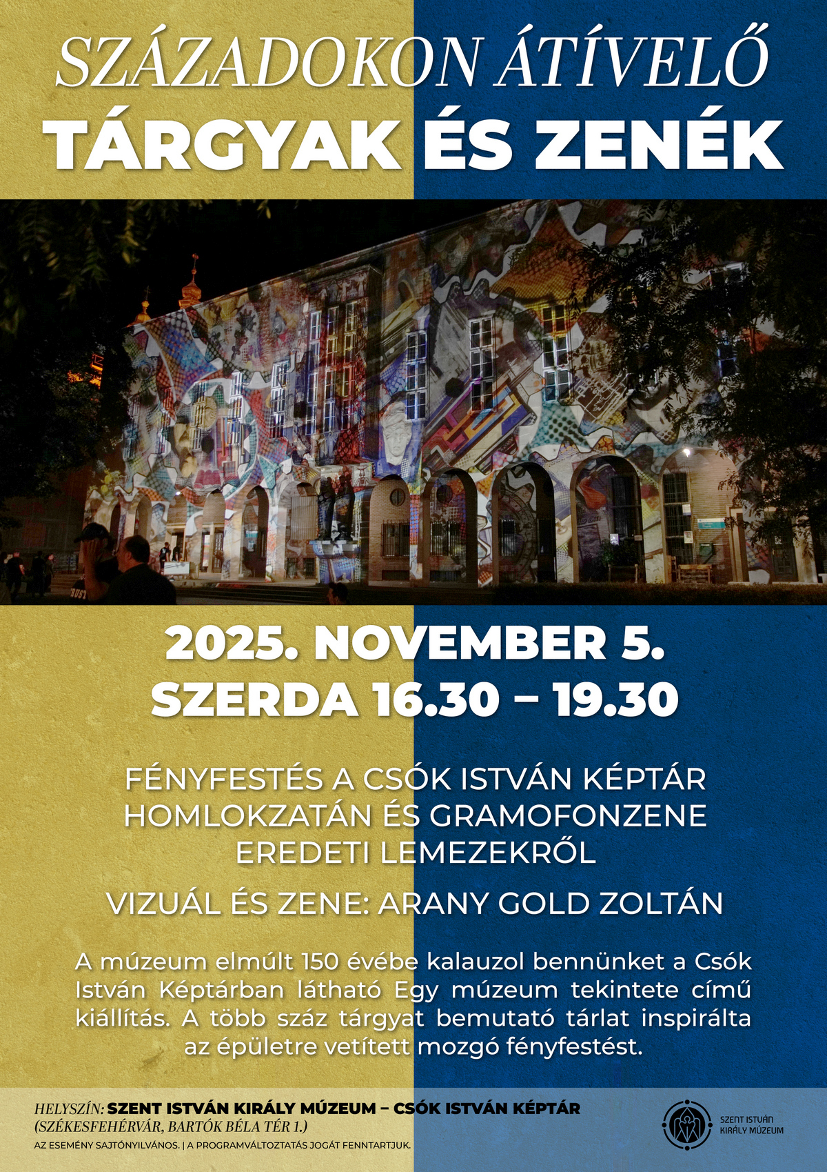 SZÁZADOKON ÁTÍVELŐ TÁRGYAK ÉS ZENÉK. FÉNYFESTÉS A CSÓK ISTVÁN KÉPTÁR HOMLOKZATÁN ÉS GRAMOFONZENE EREDETI LEMEZEKRŐL.
