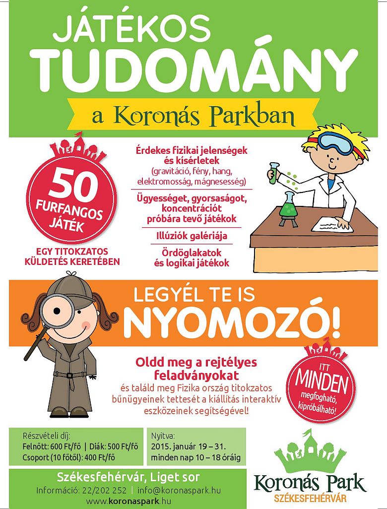 2015. január 31-ig minden nap 10 és 18 óra között "Játékos Tudomány - A fizika csodái" címmel ötven furfangos játékkal várják a kisgyermekes családokat. Egy titokzatos küldetés keretében bárkiből lehet nyomozó a fehérvári Koronás Parkban. Az érdeklődő fiatalokat többek között fizikai jelenségeket bemutató eszközök, ügyességi játékok, érzéki csalódások galériája és otthon is elkészíthető kísérletek várják.