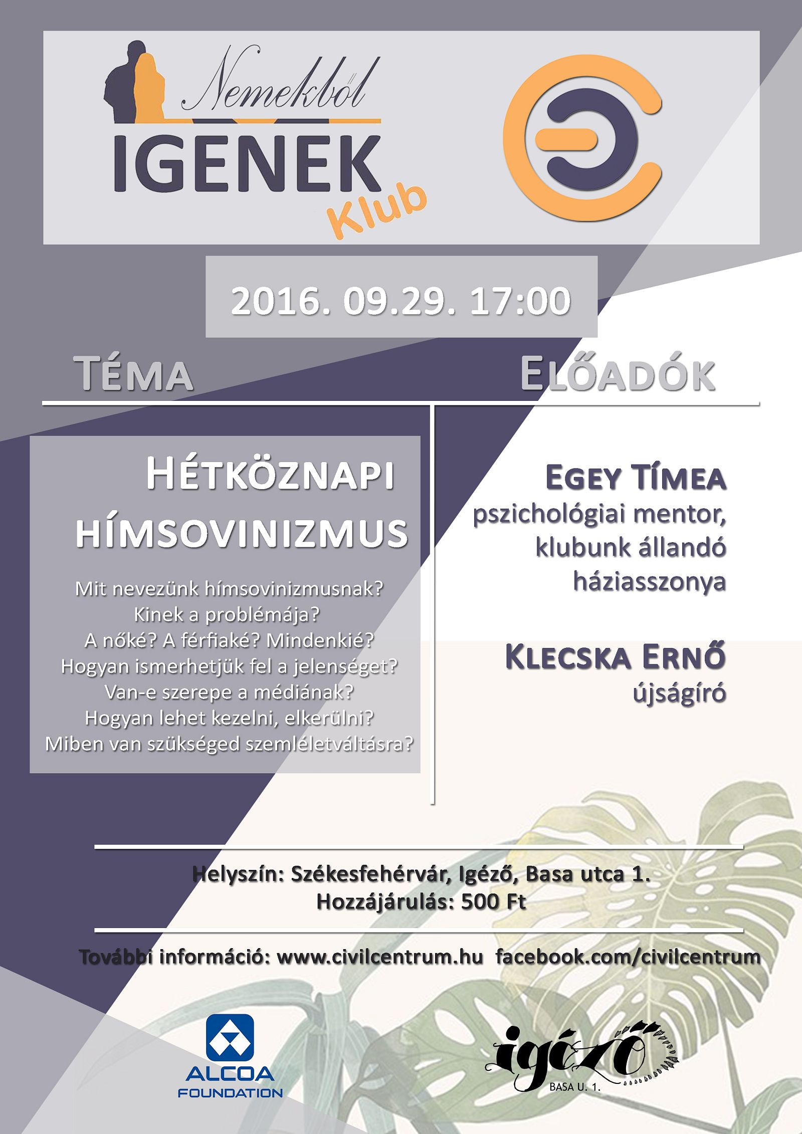 Évadnyitó Nemekből Igenek Klubra várnak mindenkit szeptember 29-én csütörtökön 17 órától az Igézőben, ahol a párkapcsolatban, munkahelyen, médiában tapasztalható hétköznapi hímsovinizmusról beszélgetnek Egey Tímea, pszichológiai mentorral és Klecska Ernő újságíróval.