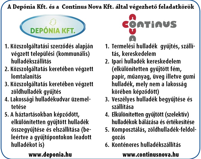 A hulladéktörvény szabályozásának megfelelően a Depónia Kft. közszolgáltatási feladatkörében szállítja el a települési hulladékot, az újonnan megalakult Continus Nova Kft. pedig az ipari vállalatok hulladékának kezelésére jogosult. A székesfehérváriak tapasztalhatták, hogy a közelmúltban átszervezésre kerültek a hulladékgazdálkodási közszolgáltatói feladatok.
