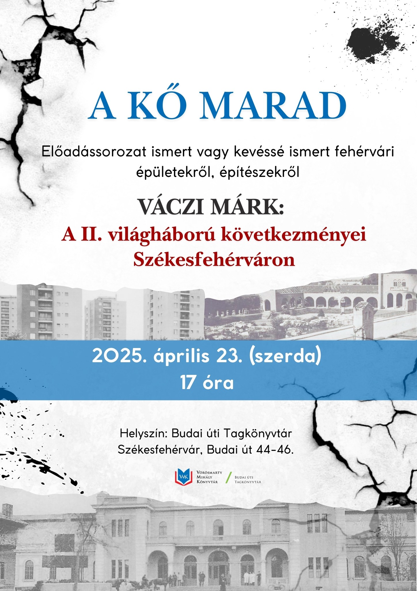 Váczi Márk előadásával folytatódik a Vörösmarty Mihály Könyvtár Budai úti Tagkönyvtárának A kő marad sorozata. A történész a II. világháború székesfehérvári következményeiről mesél április 23-án, szerdán 17 órától.