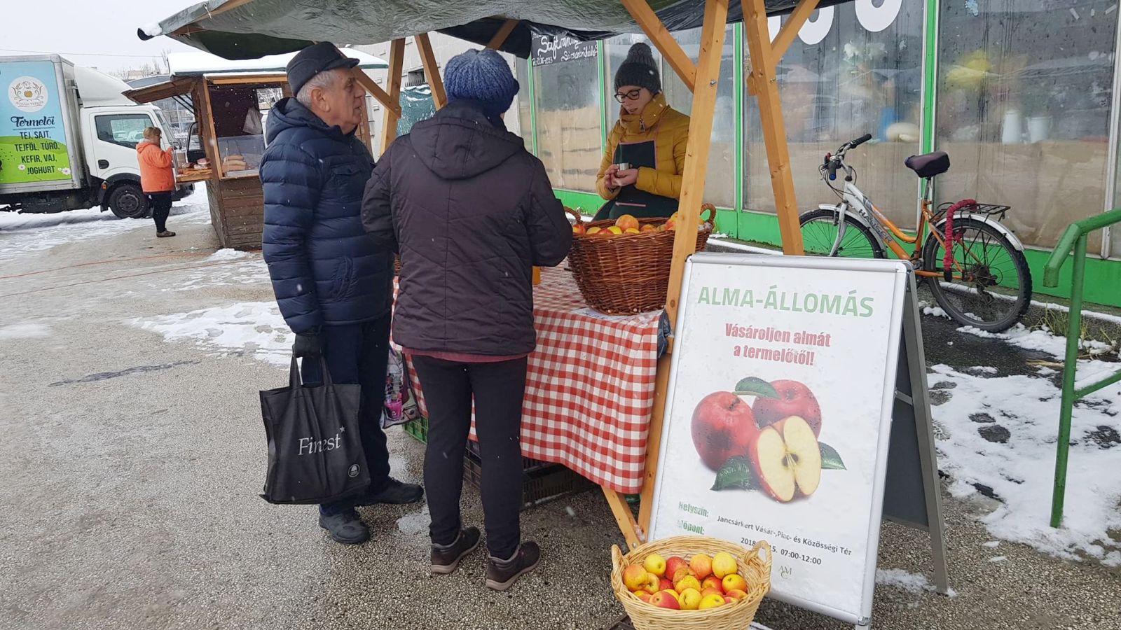 A piacon a vásárlókat "gerillakóstolással" várták a szervezők, ahol a magyaralmási Németh Családi Gazdaság szeretettel és törődéssel nevelt fáin termett almáit lehetett megízlelni.