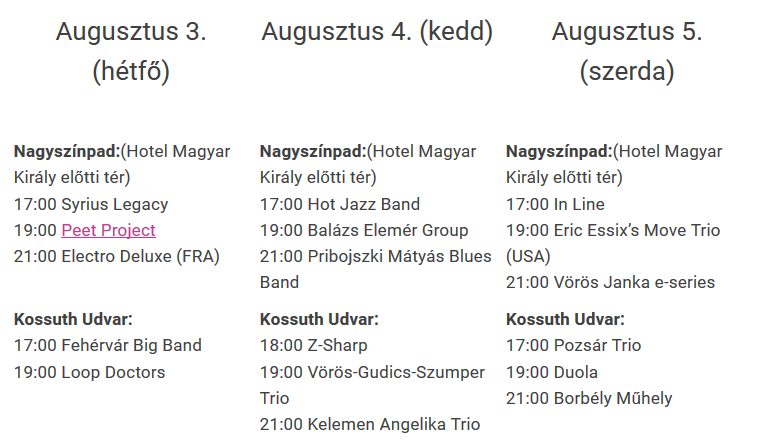 Egyedülálló zenei különleges- ségekkel várja a közönséget az Alba Regia Feszt augusztus 3-tól 5-ig. A hétfőn kezdődő három napos jazz fesztivál a Hotel Magyar Király előtti színpadon és a Kossuth udvarban kínál koncerteket. A fellépők között ott lesz a francia Electro Deluxe, az alabamai Eric Essix's Move Trio, valamint a hazai zenei élet legjobbjai, mint a Hot Jazz Band, a Pribojszki Mátyás Band vagy a Balázs Elemér Group, a Fehérvár Big Band, az In Line vagy a Vörös Janka e-series.