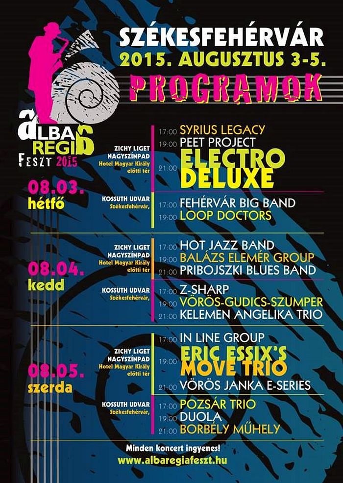 A jazz, a soul és a funk nagyjai pezsdítik fel a királyok városát három napon keresztül: augusztus 3-án, hétfőn kezdődik az Alba Regia Feszt. A tavaly első alkalommal, hatalmas sikerrel megrendezett jazz fesztivál idén tovább folytatja a megkezdett hagyományt, és két helyszínen várják koncertekkel a zenekedvelőket. A Hotel Magyar Király előtti nagyszínpadon és a Kossuth udvarban lépnek fel a nemzetközi és a magyar jazz élet legjobbjai. Fellép a világsztár Electro Deluxe az alabamai Eric Essix's Move Trio, a hazaiak közül a Hot Jazz Band, a Pribojszki Mátyás Band, a Balázs Elemér Group, a Fehérvár Big Band, az In Line vagy a Vörös Janka e-series.
