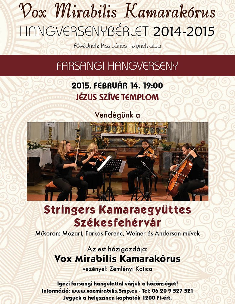 2015. február 14-én, szombaton a székesfehérvári Jézus Szíve templomban ad Farsangi Hangversenyt a Vox Mirabilis Kamarakórus. Az eseményen Mozart, Farkas Ferenc, Weiner és Anderson művei csendülnek fel. Az este 19 órakor kezdődő programon 1200 Forintos belépők megvásárlásával lehet részt venni. A koncerten vendégként a Stringers Kamaraegyüttes is fellép.