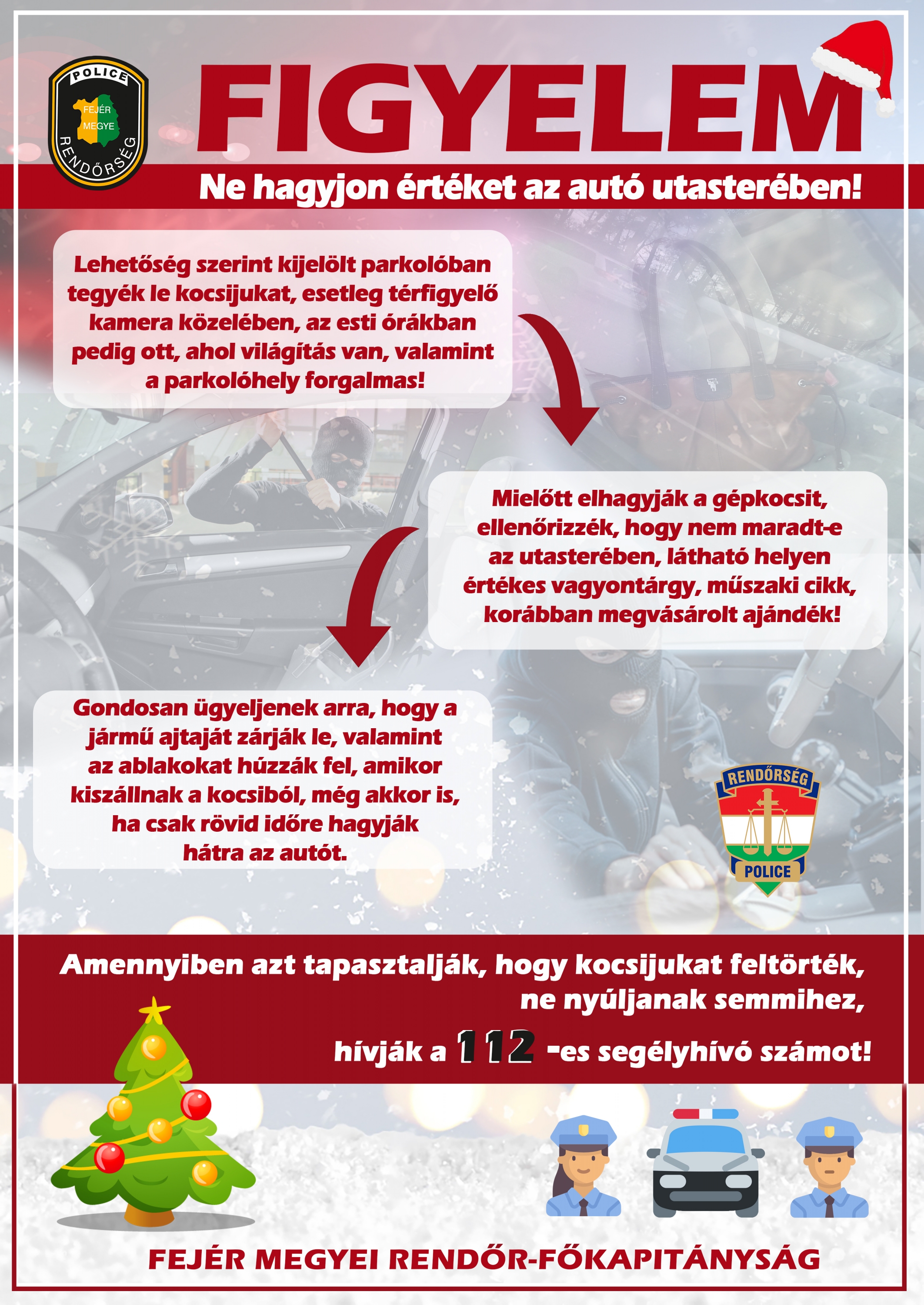 Az emelkedett hangulat sok esetben elveszi a figyelmet az alapvető vagyonbiztonsági szabályokról. Megfelelő odafigyeléssel azonban elkerülhetők az adventi időszakra leginkább jellemző lopások, gépjárműfeltörések, csalások.