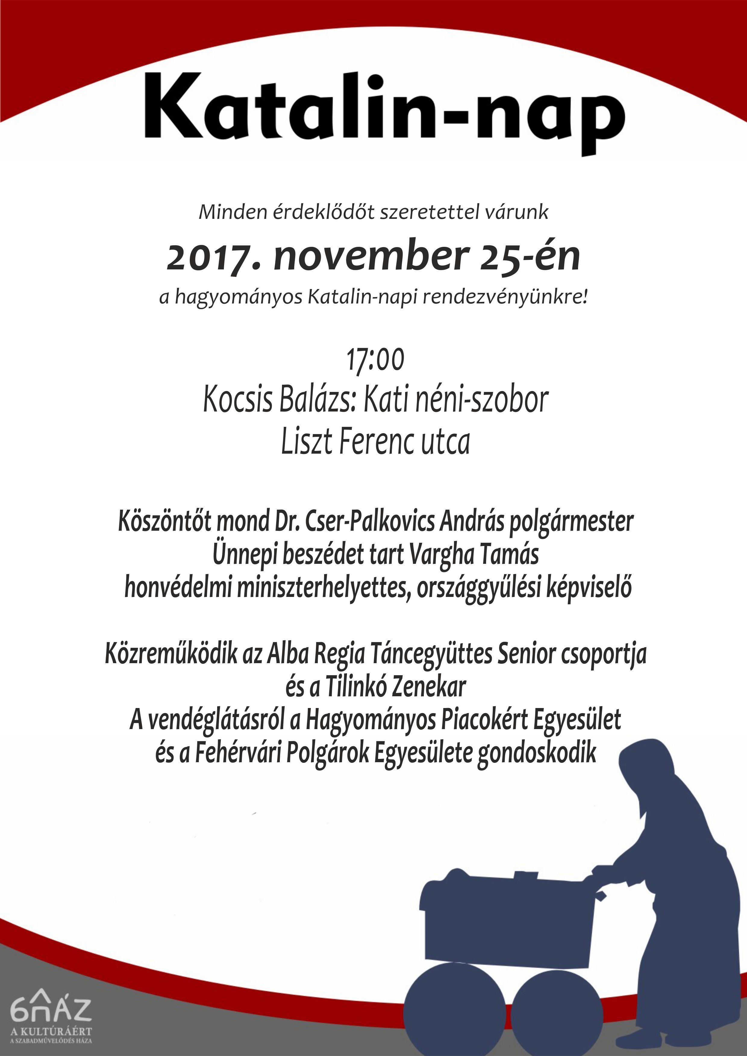 Az idén november 25-én szombaton 17 órától ünneplik a Katalinokat Kocsis Balázs Kati néni szobránál a Liszt Ferenc utcában. Az ünnepségen fellép majd az Alba Regia Táncegyüttes Senior csoportja és a Tilinkó Zenekar is. Ebben az évben csak egy helyszínen lesz rendezvény, mivel a Felsővárosi Közösségi Házban felújítási munkák zajlanak.