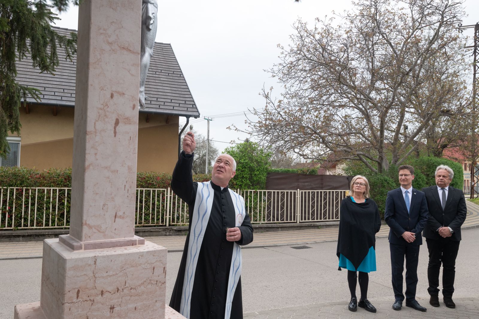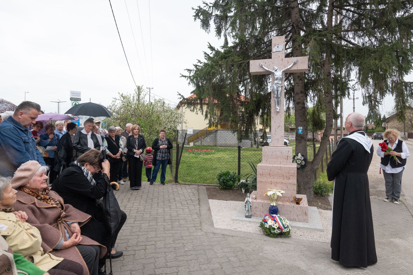 A kőkereszt felszentelése előtt Brájer Éva önkormányzati képviselő köszöntötte a szép számban megjelenteket. Mint felidézte, tavaly év vége felé, egy esős pénteki napon a kanyart, ahol a feszület állt, az egyik környékbeli lakónak nem sikerült megfelelően bevennie, és sajnos a balesetben a kereszt is jelentősen megsérült, összetört.
