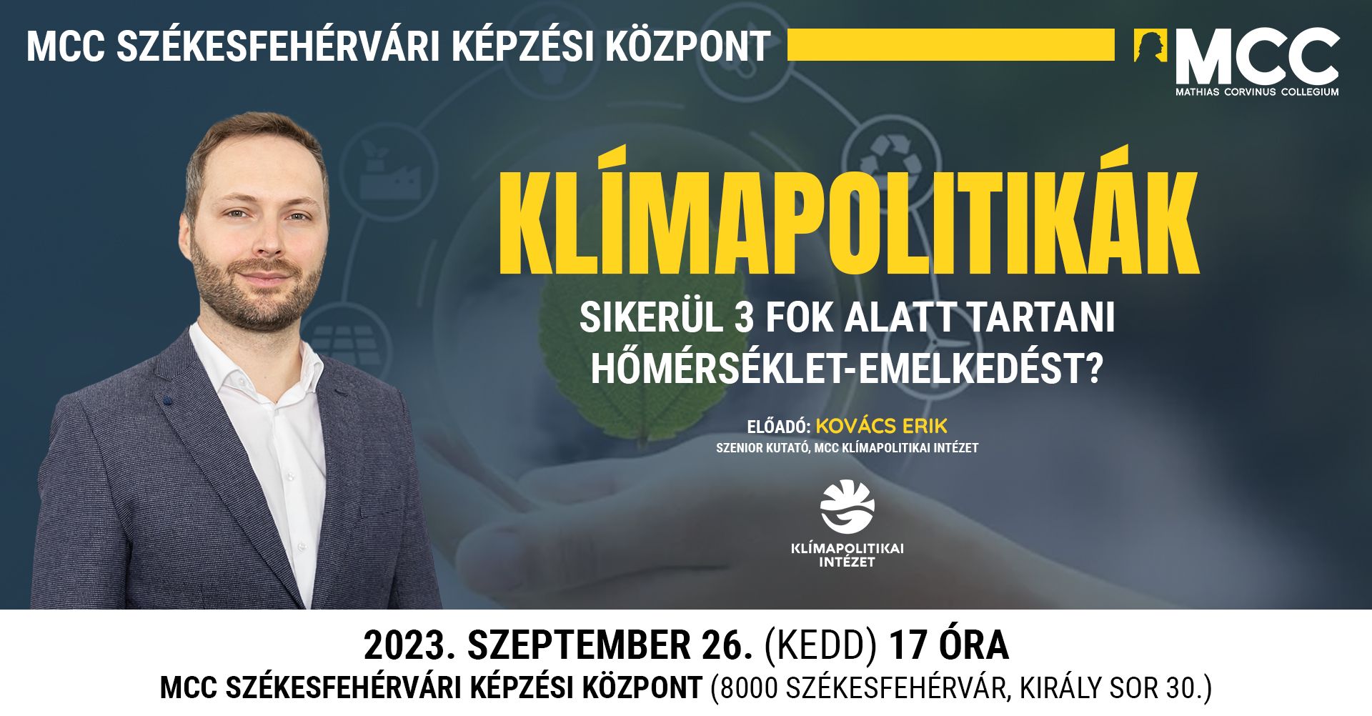 Folytatódnak a tudományos, ismeretterjesztő előadások a Mathias Corvinus Collegium Székesfehérvári Képzési Központjában. Szeptember 26-án, kedden 17.00 órakor a klímapolitikákról lesz szó. A belépés díjtalan, de regisztrációhoz kötött.