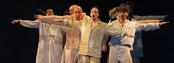 A színmű szerzője Matei Viºniec román származású francia író, aki a saját bőrén tapasztalta meg a diktatúra működését. Talán épp ezért tudja könnyed humorral, a téma abszurditását és szorongató voltát egyszerre megmutatva megidézni a kort, és kacagtatni a bitófa árnyékában, kényszerzubbonyok között. A főbb szerepekben Crespo Rodrigót, Kozáry Ferencet, Bata Jánost, Bakonyi Csillát és Kelemen Istvánt láthatja a közönség.