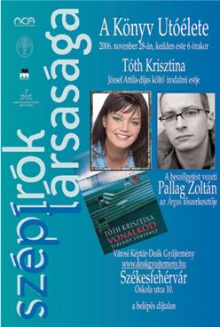 November 28-án este 6 órakor Székesfehérváron a Városi Képtár-Deák Gyűjteményben a Könyv utóélete címmel Tóth Kriszta irodalmi estje lesz látható, beszélgetőtársa Pallag Zoltán az Árgus főszerkesztője. Az írónőnek az idén jelent meg a Magvető kiadó gondozásában Vonalkód c. könyve. Tóth Krisztina életpályája: