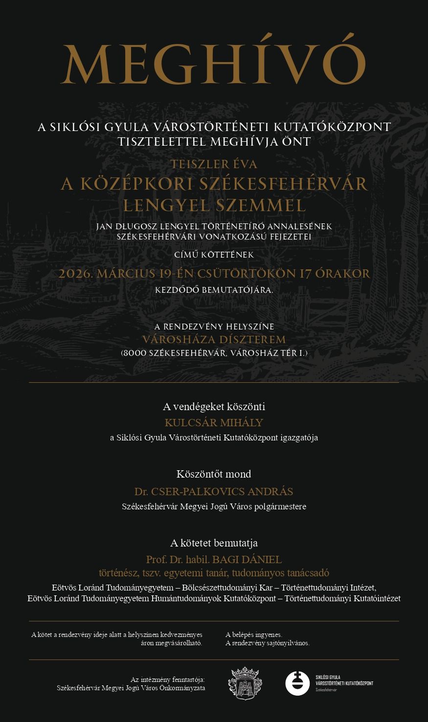 A könyvbemutatón dr. Cser-Palkovics András, Székesfehérvár Megyei Jogú Város polgármestere, valamint a kötet kiadója és társszerkesztője, a Siklósi Gyula Várostörténeti Kutatóközpont igazgatója, Kulcsár Mihály mond köszöntőt. A kötetet a középkori lengyel-magyar kapcsolatok szakértője, prof. dr. Bagi Dániel, az Eötvös Loránd Tudományegyetem Történettudományi intézetének tanszékvezető egyetemi tanára és az ELTE HTK Történettudományi Kutatóintézetének tudományos tanácsadója mutatja be.