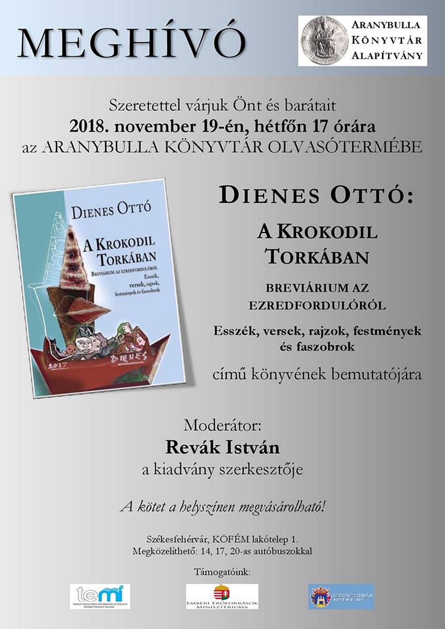 November 19-én, hétfőn 17 órakor kezdődik Dr. Dienes Ottó: A krokodil torkában - Breviárium az ezredfordulóról - esszék, versek, rajzok, festmények és faszobrok című könyvének bemutatója az Aranybulla Könyvtárban.(Köfém lakótelep 1.) A szerzővel beszélget Revák István, a kiadvány szerkesztője. A belépés díjtalan, minden érdeklődőt szeretettel várnak.