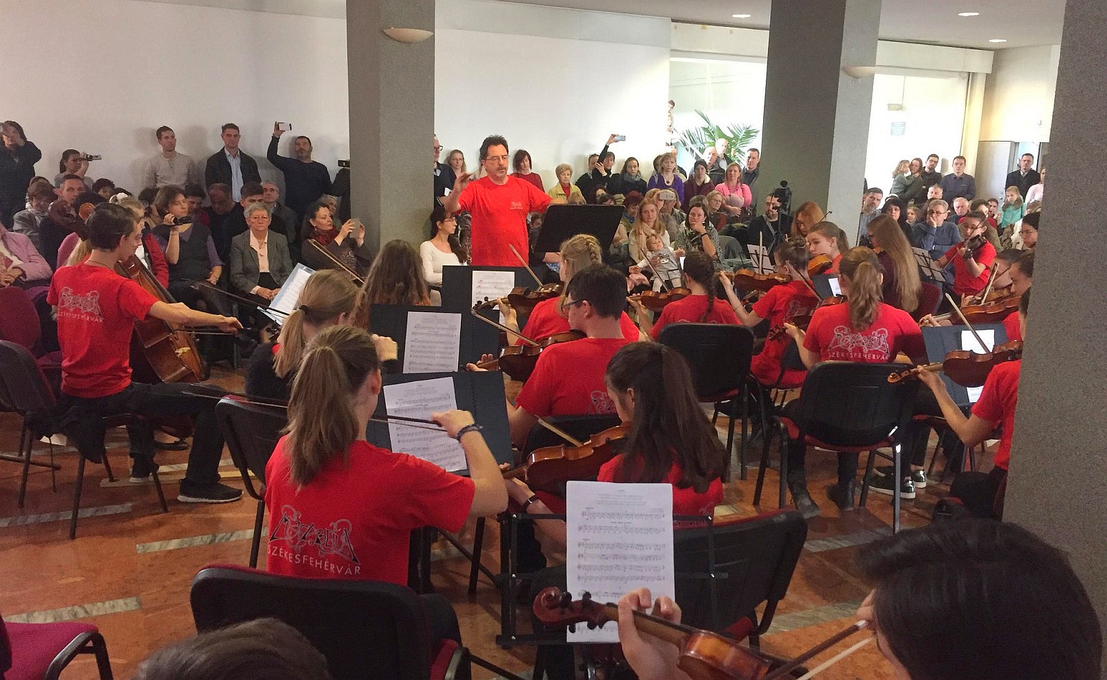 A legkisebb "Cérnahangoktól" a középiskolásokon át a tanárokig szinte a teljes vonós tanszak hegedűt ragadott ma délelőtt. A 30 éves hagyományra visszatekintő "100 hegedűs" koncertet az Alba Regia Szimfonikus Zenekar próbatermében tartotta a Hermann László Zeneiskola.