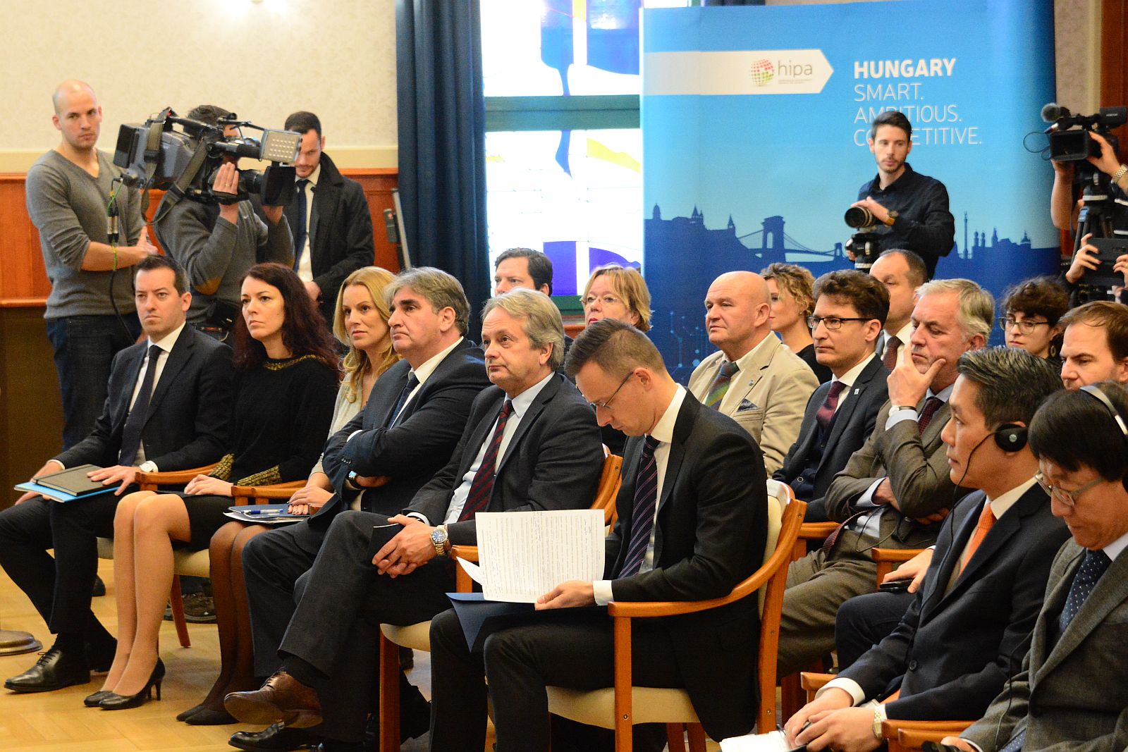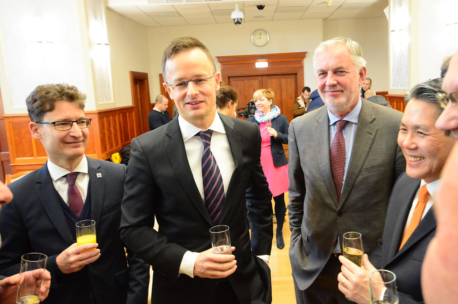Cser-Palkovics András, Székesfehérvár polgármestere, Szijjártó Péter külgazdasági és külügyminiszter, Páva Zsolt, Pécs polgármestere és Min Szung, a Hanon Systems elnökhelyettese beszélget a Hanon Systems Hungary Kft. beruházásáról tartott sajtótájékoztatón a Külgazdasági és Külügyminisztériumban.