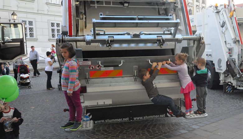 A gyerekek mellett a felnőttek is élvezték, hogy testközelből ismerkedhettek egy igazi kukásautóval.