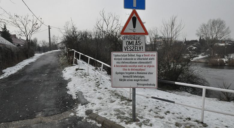 Péntek délután ismét leszakadt a Bányató melletti partfal-szakasz egy része. A Városgondnokság szakemberei azonnal intézkedtek: a balesetveszély miatt lezárták a Donát út Bányató feletti részét. A statikai vélemény elkészültéig gyalogosan sem lehet közlekedni ezen a szakaszon.