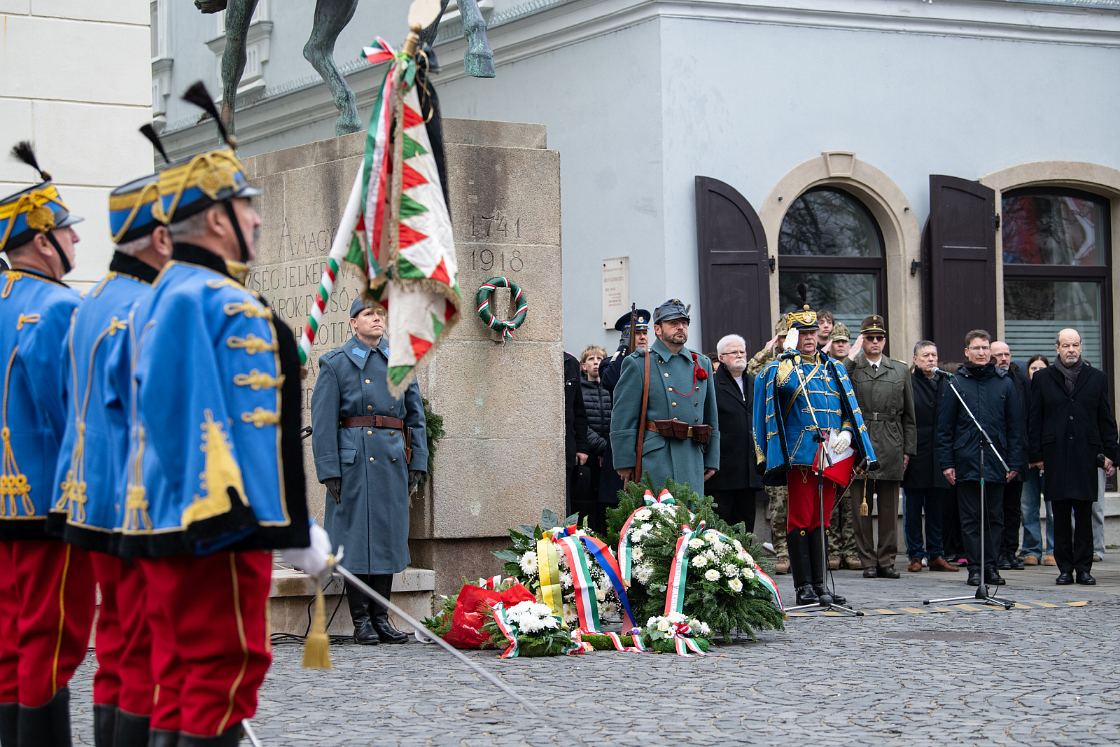 A Pátzay Pál lovasszobránál tartott megemlékezés a Himnusz hangjaival kezdődött, miután a déli harangszóra a hagyományőrző huszárok Ampli Ferenc parancsnok vezetésével bevonultak a térre, s a parancsnok kérésére dr. Cser-Palkovics András polgármester ünnepélyesen engedélyt adott a 10-es huszárok emlékművének megkoszorúzására.