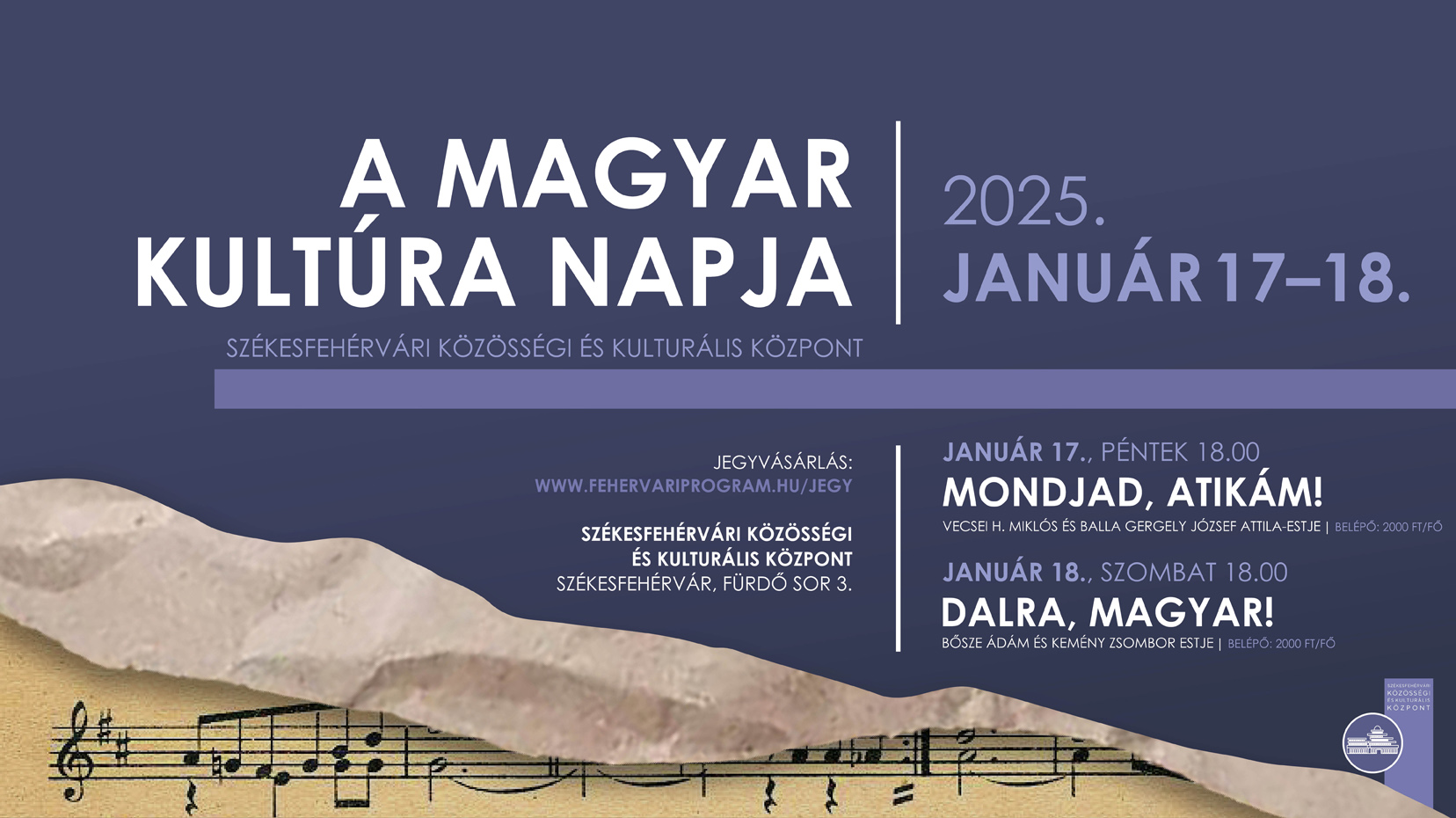 A Székesfehérvári Közösségi és Kulturális Központban január 17-én, pénteken Vecsei H. Miklós és Balla Gergely József Attila-estjének lehet részese a közönség, másnap, szombaton pedig Bősze Ádám zenetörténész kalandozik a magyar nép leghíresebb dallamai között, Kemény Zsombor zongoraművész közreműködésével. (Az estekre minden jegy elkelt.)