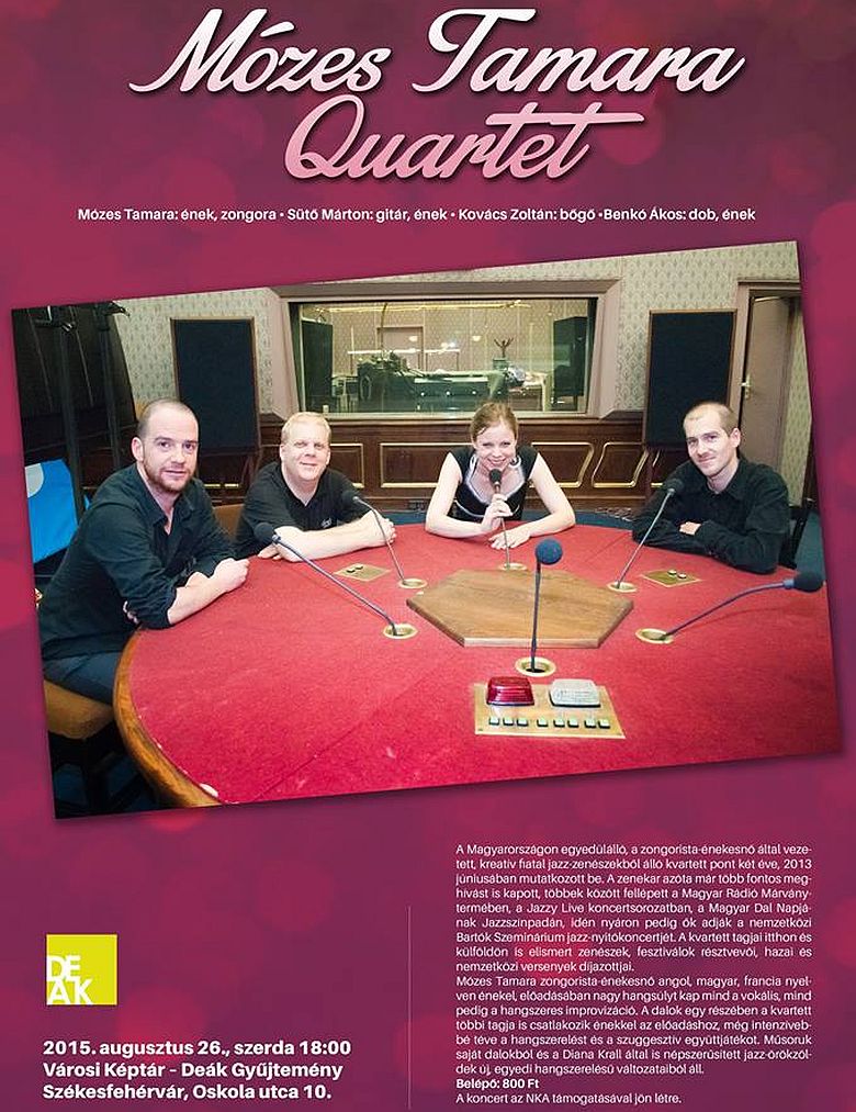 2015. augusztus 26-án, szerdán este a Mózes Tamara Quartet ad koncertet a Városi Képtár – Deák Gyűjteményben. A programon Mózes Tamara (ének, zongora), Sütő Márton (gitár, ének), Kovács Zoltán (bőgő), Benkó Ákos (dob, ének) gondoskodik a kiváló hangulatról. Az este 18.00 órakor kezdődő kulturális eseményre sok szeretettel várnak minden érdeklődőt a szervezők.