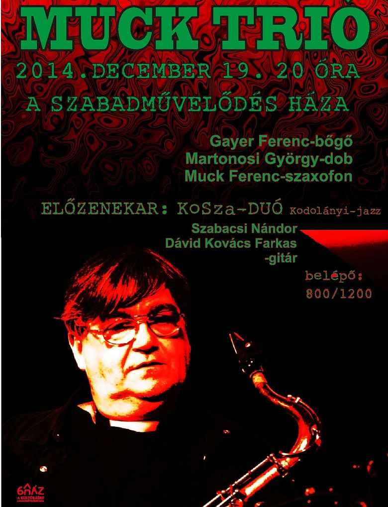 2014. december 19-én, pénteken este 20 órától a Muck Trió lép fel A Szabadművelődés Házában (Székesfehérvár, Fürdő sor 3.). Az eseményen Gayer Ferenc bőgőn, Martonosi György dobon, Muck Ferenc pedig szaxofonon működik majd közre. Az eseményen elő-zenekarként a Kosza-DUÓ is zenél majd a közönségnek. A koncertre 800, illetve 1200 Forintos jegyek megváltásával lehet bejutni.