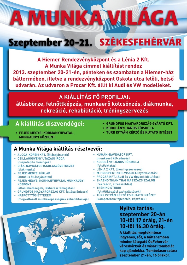 „A Munka Világa” kiállítás a Lénia 2 Kft. és a Hiemer Rendezvényközpont közreműködésével valósul meg. Fő témakörei: állásbörze, munkaerő-kölcsönzés, diákmunka, felnőttképzés, kompetenciafejlesztés, felsőoktatás, rehabilitáció, rekreáció és tréningszervezés. A kiállítás díszvendégeként jelen lesz a Fejér Megyei Kormányhivatal Munkaügyi Központja, a Grundfos Magyarország Gyártó Kft., a Kodolányi János Főiskola, valamint a Türr István Képző és Kutató Központ, rajtuk kívül további székesfehérvári vállalkozások és szolgáltatók mutatják be aktuális ajánlataikat. Szeptember 20-án, pénteken 10.00-17.00 óra között, 21-én, szombaton 10.00-16.30 óra között várják az érdeklődőket a Hiemer-ház báltermében.