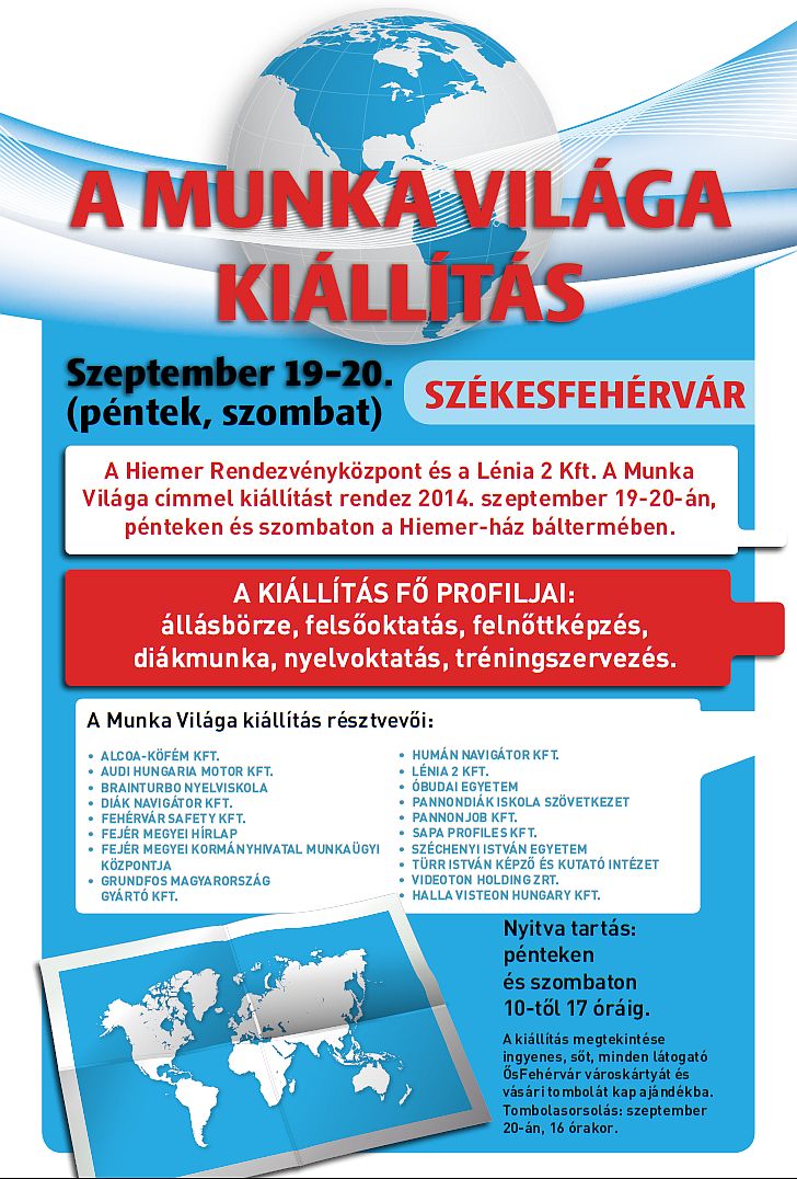 „A Munka Világa” kiállítás idén is a székesfehérvári Lénia 2 Kft. és Hiemer Rendezvényközpont közös szervezésében valósul meg. Fő témakörei: állásbörze, felsőoktatás, felnőttképzés, diákmunka, nyelvoktatás és tréningszervezés. A szervezők teltházas rendezvényre készülnek, a kiállítók minden kiadó helyet lefoglaltak, és a tavalyi tapasztalatok alapján óriási érdeklődés várható a látogatók részéről is. A résztvevők között neves cégek – például az Alcoa-Köfém Kft., az Audi Hungaria Motor Kft., a Grundfos Magyarország Gyártó Kft., a Videoton Holding Zrt. és a SAPA Profiles Kft. – szerepelnek, de képviselteti magát számos ismert oktatás- és képzésszervező egyetem, intézmény, vállalkozás és szolgáltató. A kiállítás szeptember 19-én és 20-án, 10.00 és 17.00 óra között tart nyitva a Hiemer-házban. Az ünnepélyes megnyitót pénteken 10.15 órakor tartják dr. Horváth Miklósné, a Gazdasági Szakbizottság elnöke részvételével.