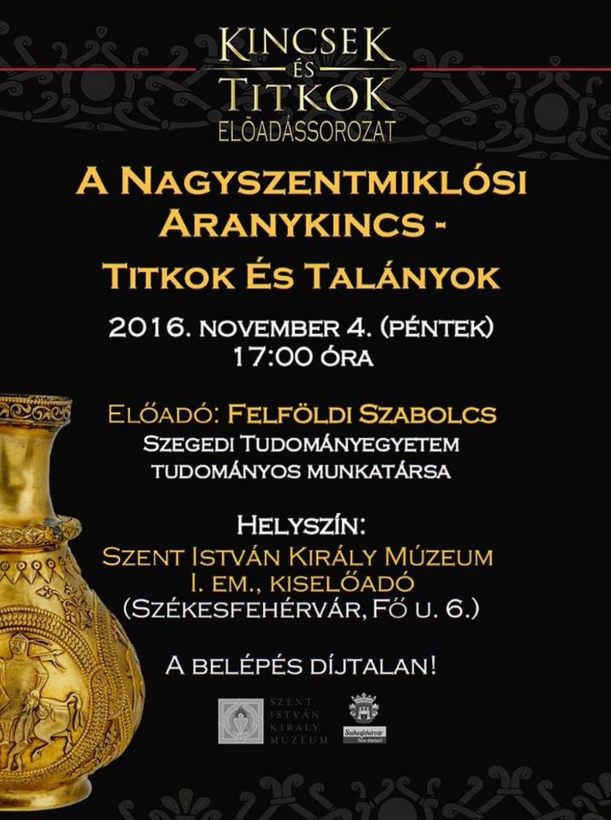 November 4-én, pénteken este 17.00 órakor kezdődik Dr. Felföldi Szabolcs A nagyszent- miklósi aranykincs – Titkok és talányok című előadása a Múzeumban. A kulturális rendezvény sok szeretettel várnak minden érdeklődőt a Szent István Király Múzeum, I. emeleti kiselőadójába! Az eseményre díjtalan a belépés.