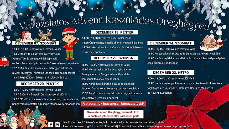 Az ünnepi fénybe öltözött székesfehérvári belvárost képeskönyvbe illő művészeti installációk és fényjátékok színesítik, minden a közös ünnepvárásra hívogat. Kézműves ajándékkészítő műhelyek, karácsonyváró családi programok, meghitt elcsendesülés jótékonysági vásárral és míves kézműves portékákkal, ünnepi koncertek, színházi és balettszínházi előadások.