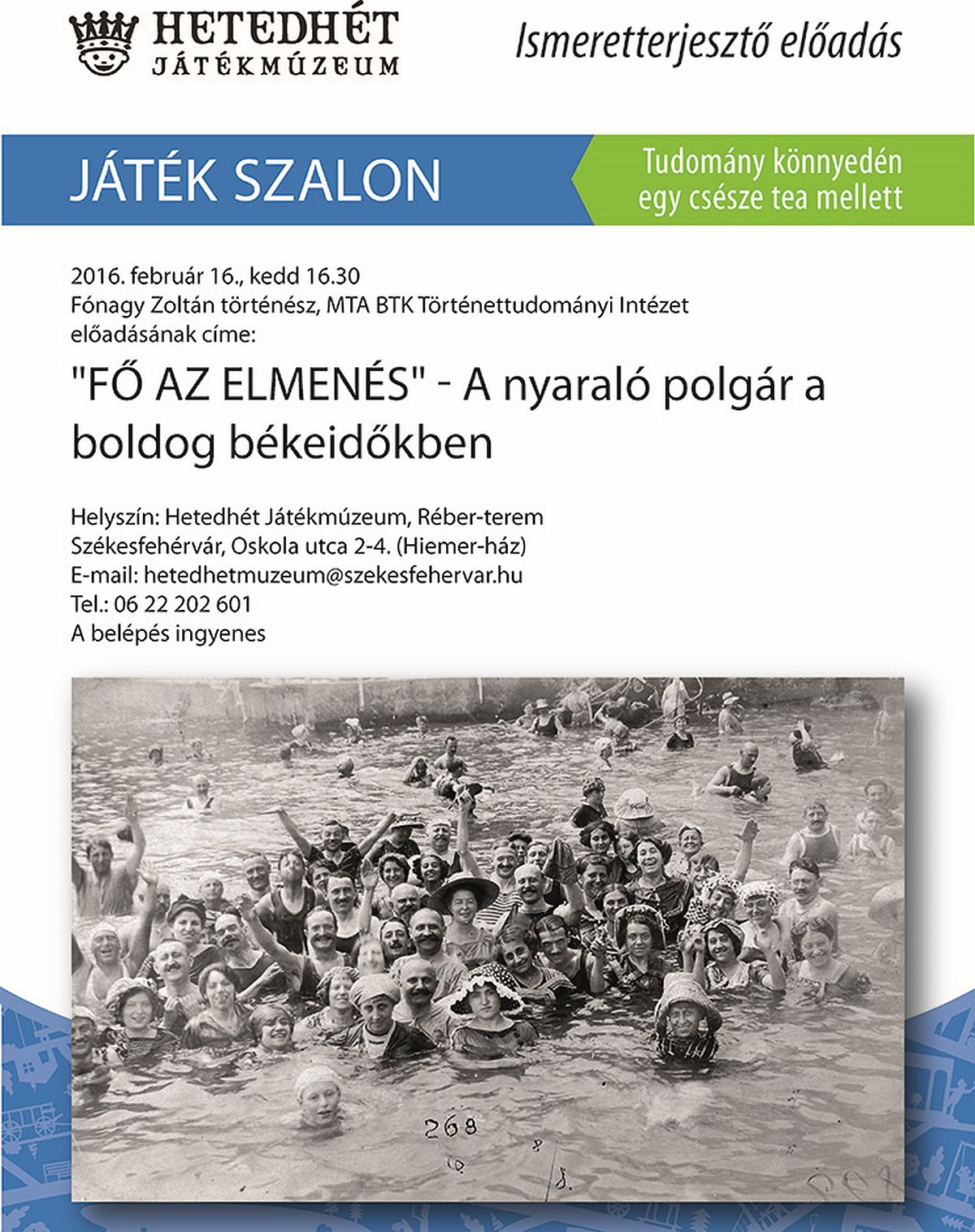 A Hetedhét Játékmúzeum Réber-terme a polgári szalonok teadélutáni hangulatát varázsolja az érdeklődők elé, különböző ismeretterjesztő előadásai révén. A holnap délután a boldog békeidők, azaz a 19. század nyaralási, utazási szokásairól fog szólni. A témáról Fónagy Zoltán történész tart előadást. Az ingyenes programra mindenkit szeretettel várnak!