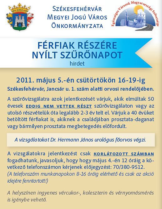 Május 5-én, jövő héten csütörtökön a férfiak számára is nyílt egészségügyi szűrőnapot tartanak a Jancsár utcai rendelőben. Két hete hétvégén a nőknek rendeztek szűrőnapot, melyen 160 nőgyógyászati vizsgálatot végeztek el. A szűrőprogramra Östör Annamária egészségügyi tanácsnok és dr. Keresztury Lászlóné hívta fel a figyelmet. Mint mondták akkora érdeklődés van a program iránt, hogy rendszeressé teszik a nyílt szűrővizsgálatokat.