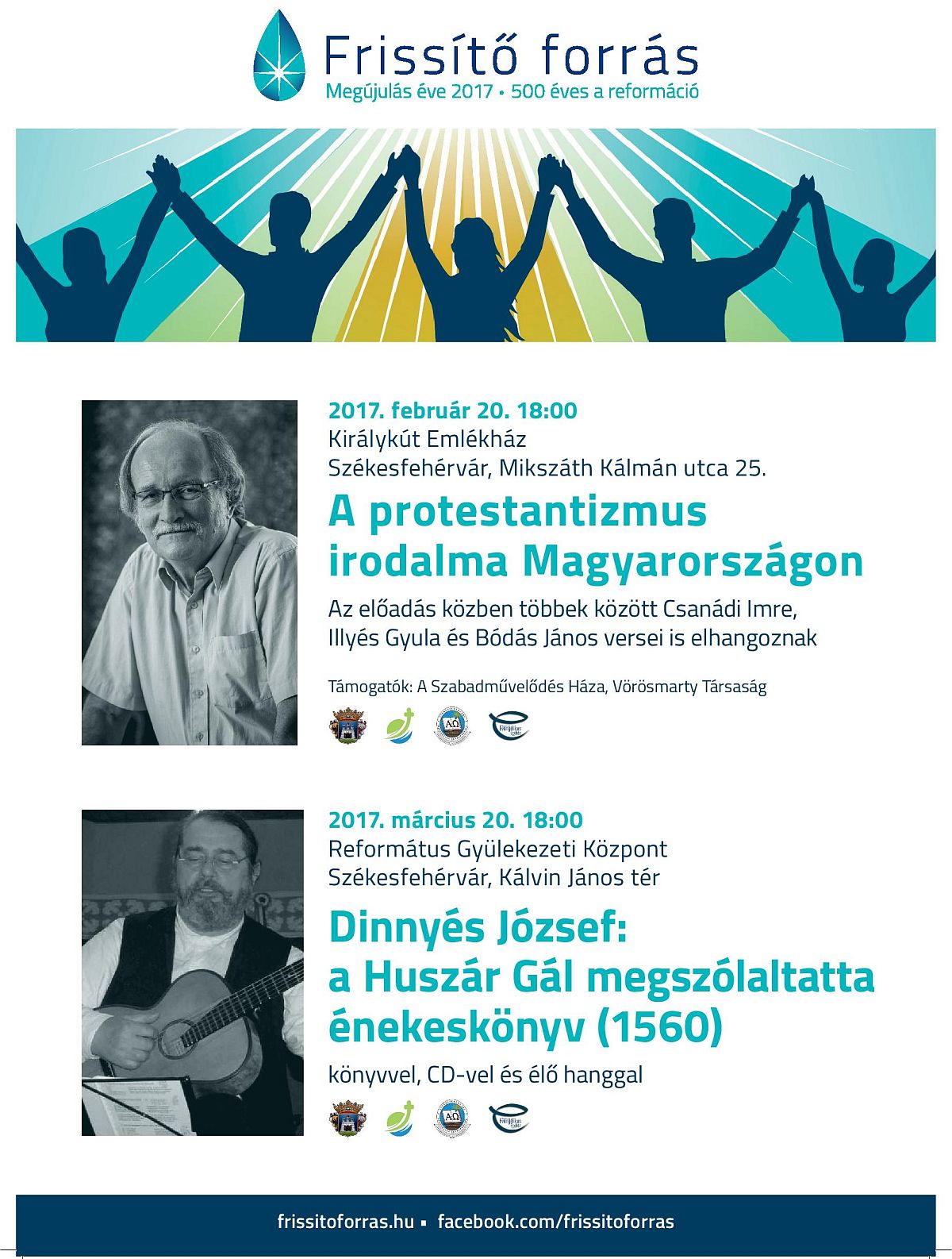 A Reformáció 500. évfordulója kapcsán Székesfehérváron Frissítő forrás – Megújulás éve 2017 mottóval jubileumi programsorozat indult, melynek soron következő rendezvénye február 20-án lesz. A Királykút Emlékházban 18 órakor kezdődik az az irodalmi est, melyen Bakonyi István József Attila-díjas irodalomtörténész tart előadást A protestantizmus irodalma Magyarországon címmel, miközben Csanádi Imre, Illyés Gyula és Bódás János versei is elhangoznak. A programra minden irodalomkedvelőt szeretettel várnak!