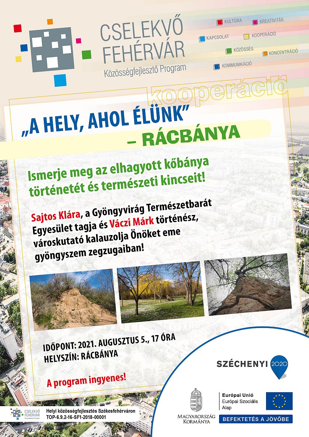 A Rácbányában folytatódik a „A hely, ahol élünk” városismereti séta. A Cselekvő Fehérvár program keretében augusztus 5-én, csütörtökön 17 órakor induló programot Sajtos Klára a Gyöngyvirág Természetbarát Egyesület tagja és Váczi Márk történész, városkutató vezeti. A program mindenki számára ingyenes!