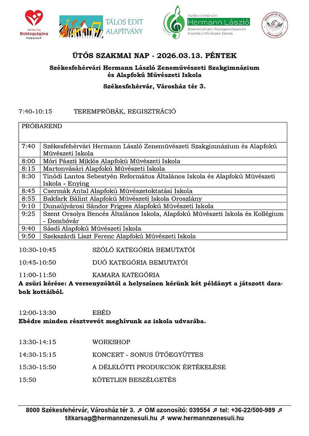 Első alkalommal rendezi meg a Székesfehérvári Regionális Ütőhangszeres Találkozó és Szakmai Napot a Hermann László Zeneművészeti Szakgimnázium és AMI, valamint a Tálos Edit Alapítvány március 13-án.