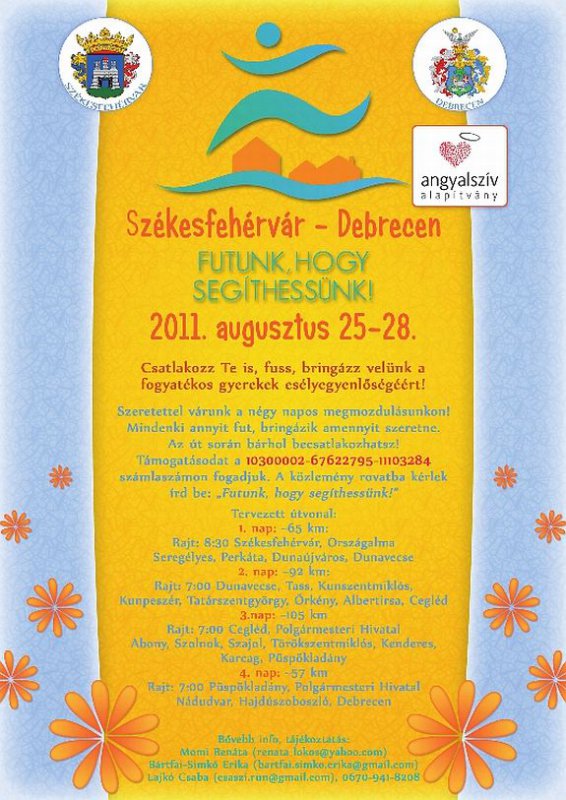 Lajkó Csaba székesfehérvári ultrafutó társaival együtt a tavalyi ónodi és kolontári jótékonysági futás után idén az Angyalszív Alapítvány legfőbb céljáért, a fogyatékos gyermekek esélyegyenlőségéért futnak és kerékpároznak Székesfehérvárról Debrecenbe augusztus 25 és 28 között. A futás során arra szeretnénk felhívni a társadalom figyelmét, hogy a sérült gyermekek esélyegyenlősége még mindig utópia.