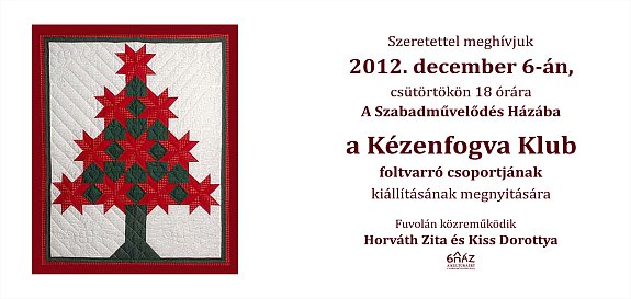 A Kézenfogva Klub felvarró csoportjának alkotásaiból nyílik kiállítás december 6-án, csütörtökön a Szabadművelődés Házában. A megnyitó este 18-órakor lesz a Fürdő sor 3.-as szám alatt, a Csónakázó-tónál. Fuvolán közreműködik Horváth Zita és Kiss Dorottya. A rendezők mindenkit szeretettel várnak a rendezvényre.
