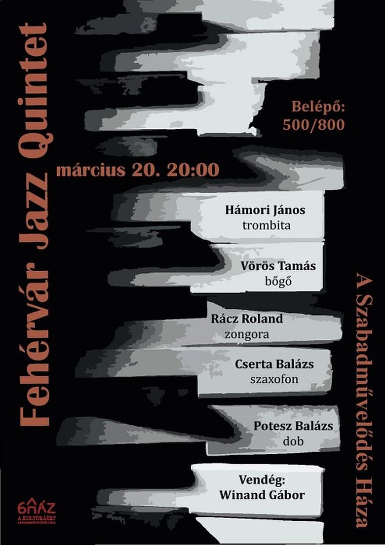 A Szabad-művelődés Házába várják a jazz kedvelő közönséget március 20-án, csütörtökön este nyolc órakor a Fehérvár Jazz Quintet koncertjére. A zenekar tagjai kincset érő fehérvári zenészek: bőgőn Vörös Tamás, trombitán Hámori János, szaxofonon Cserta Balázs, zongorán Rácz Roland játszik, a ritmust pedig Potesz Balázs adja a dobok mögött. A koncerten Winand Gábor működik közre vendégként.