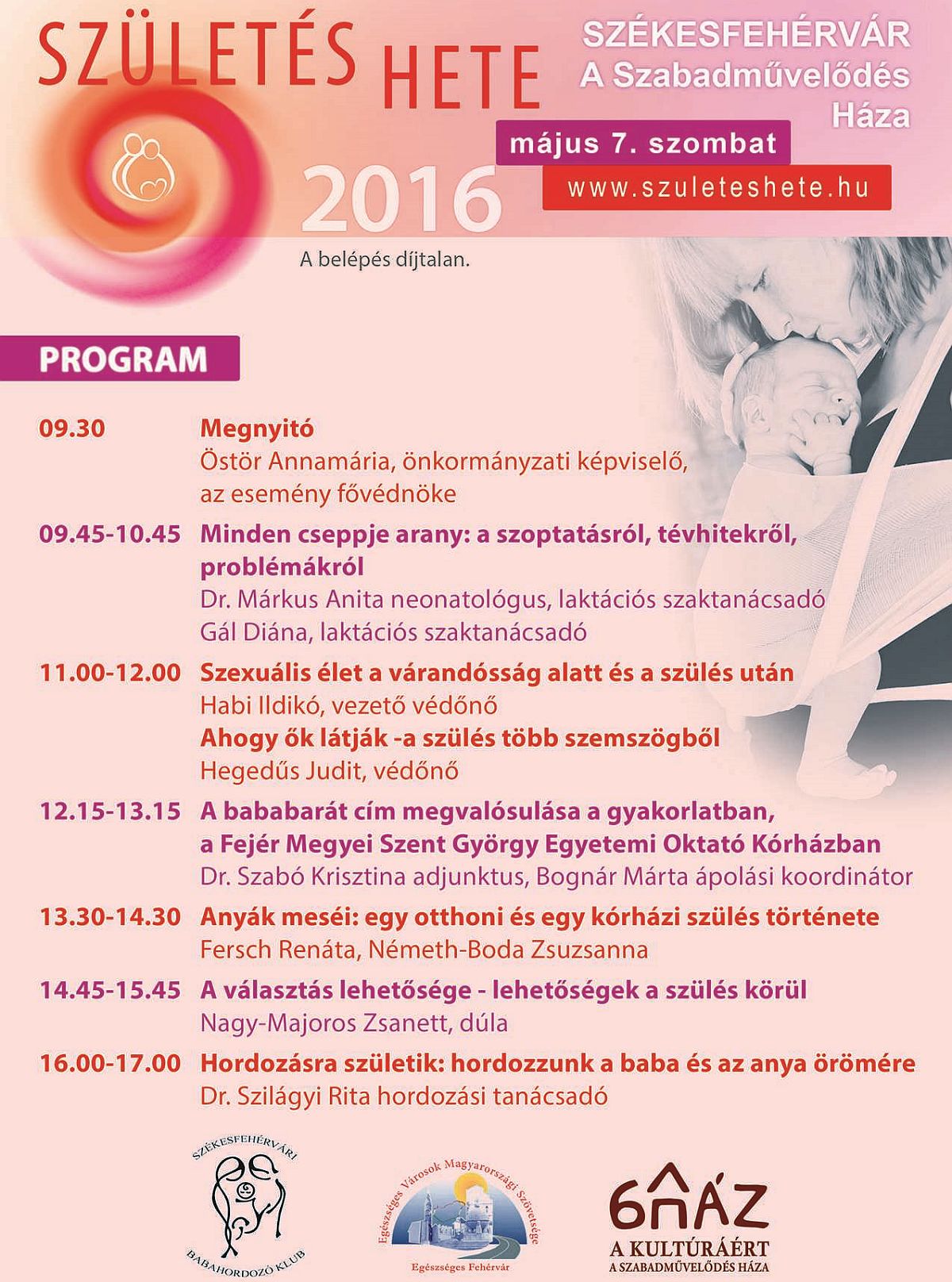 A Születés Hete székesfehérvári programja szombaton reggel 09.30 órakor kezdődik, a rendezvényt a program fővédnöke, Östör Annamária egészségügyi és sporttanácsnok nyitja meg. Ezt követően „Minden cseppje arany: szoptatásról, tévhitekről, problémákról” címmel tart előadást Dr. Márkus Anita neonatológus, laktációs szaktanácsadó, valamint Gál Diána laktációs szaktanácsadó. Az esemény délelőtti blokkjában Habi Ildikó vezető védőnő szól a várandóság alatti és a szülés utáni szexuális életről, majd a szülést mutatja be több szempontból Hegedűs Judit védőnő.
