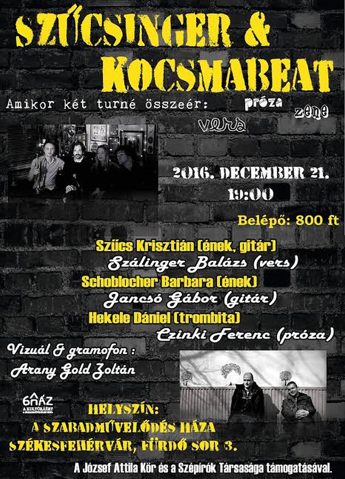 December 21-én a Szűcsinger & Kocsmabeat formáció lép fel A Szabad- művelődés Házában, ahol vers, próza és zene várja az érdeklődőket. A 19 órakor kezdődő eseményen Szűcs Krisztián (ének, gitár), Szálinger Bence (vers), Schoblocher Barbara (ének), Jancsó Gábor (gitár), Hekele Dániel (trombita) és Czinki Ferenc (próza) várja az érdeklődőket. Közreműködik Arany Gold Zoltán (vizuál & gramofon).