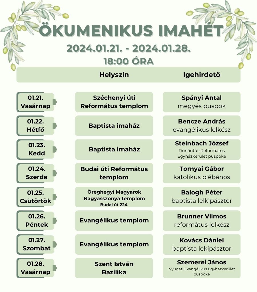Az imahetet január 21-én, vasárnap a Széchenyi úti Református templomban Spányi Antal, a Székesfehérvári Egyházmegye megyés püspöke nyitja meg. Hétfőn a Baptista imaházban Bencze András evangélikus lelkész, kedden szintén ezen a helyszínen Steinbach József, a Dunántúli Református Egyházkerület püspöke, a Magyarországi Egyházak Ökumneikus Tanácsa elnöke lesz a vendég. Szerdán a Budai úti Református templomban Tornyai Gábor katolikus plébános, csütörtökön az Öreghegyi Magyarok Nagyasszonya templomban Balogh Péter baptista lelkipásztor hirdet igét. az Az Evangélikus templomban pénteken Brunner Vilmos református lelkész, szombaton Kovács Dániel baptista lelkipásztor szól a hívekhez. Az Ökumenikus Imahetet január 28-án, vasárnap a Szent István-székesegyházban Szemerei János, a Nyugati Evangélikus Egyházkerület püspöke zárja.