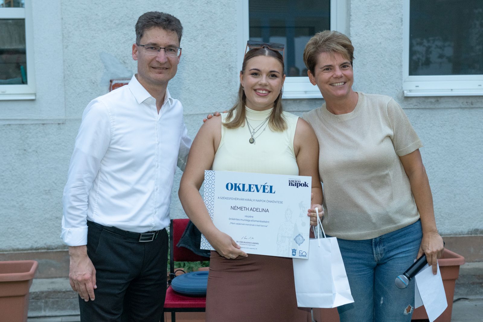 A Székesfehérvári Királyi Napok „Mert valakinek menőnek is kell lennie” címet Németh Adelina és Andrássy Réka önkéntesek érdemelték ki. Az „Ők bizonyítják: a jó szív sosem vonul nyugdíjba” oklevelet a Szárazréti Nyugdíjas Klub és az Öreghegyi Nyugdíjas Klub vezetői vehették át tagjaik aktív és lelkes munkájáért. Az oklevelek átadása után nagy tapssal köszöntötték az önkéntes diákok közül Venczel Lénát és Csúri Zsófiát, akiknek Juhász Zsófia és dr. Cser-Palkovics András külön köszönetet mondott, mert kellő lazasággal, eltökéltséggel és rengeteg humorral segítették a szervezők munkáját.