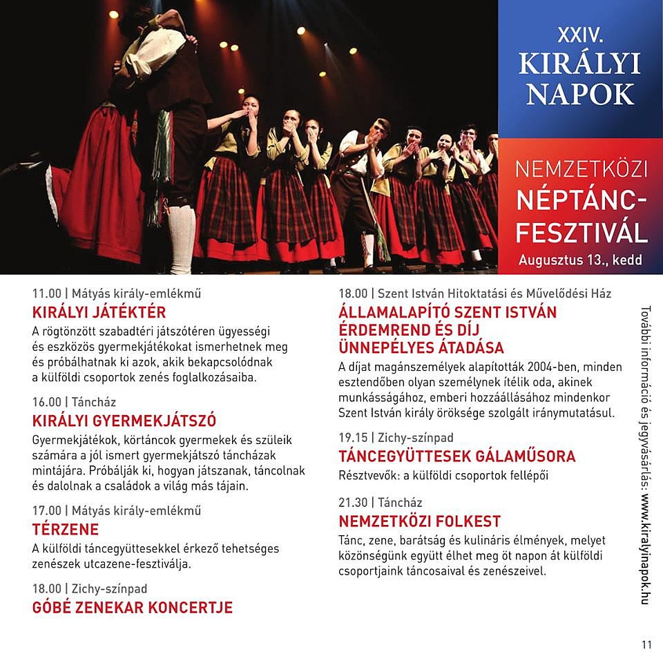 A néptáncfesztivál a hagyományos programelemekkel várja a látogatókat: 11.00 órakor a Mátyás király-emlékműnél királyi játéktér, 16.00 órakor a Tánházban királyi gyermekjátszó lesz, 17.00 órakor térzenét hallhatunk a táncosokat kísérő zenekarok közreműködésével, 19.15 órakor gálaműsoron lépnek fel a külföldi táncosok a Zichy színpadon, 21.30 órakor pedig nemzetközi folkesttel zárul a nap a Táncházban.