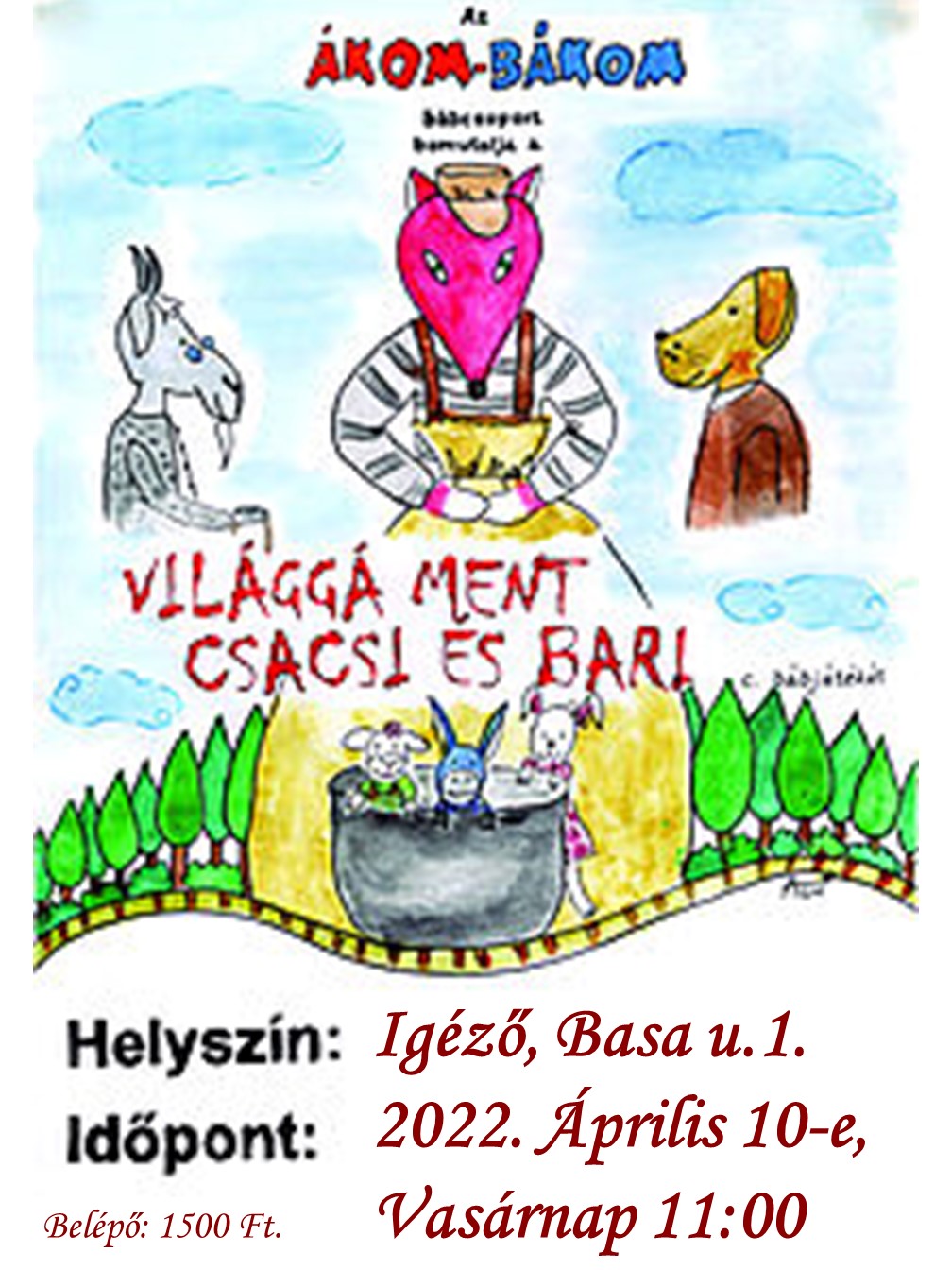 A "Világgá ment Csacsi és Bari" című előadással várja a kicsiket és a nagyokat április 10-én, vasránap 11 órakor, az Igéző. Az Ákom-Bákom Bábcsoport bábelőadásában Csacsi elhatározza, hogy megnézi, mi van a kerítésen túl. Útitársat is talál magának Bari személyében. Vándorlásuk során hamar rájönnek, hogy a kerítésen túl nem csak virágzó mező van, hanem egy sötét erdő és benne a ravasz róka. Habár úgy tűnik, Róka báránypörköltet fog vacsorázni, a gazda hűséges kutyája végül megjelenik és egyszeriben füstbe száll Róka terve. Örül, ha irháját mentheti…