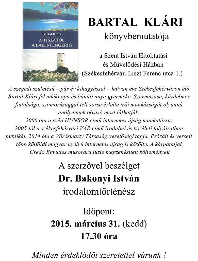 Kedden délután 17.30-kor kezdődik Bartal Klára: "A Tiszától a Balti-tengerig" című könyvének bemutatója a Szent István Művelődési Házban. A szegedi születésű hatvan éve Székesfehérváron élő Bartal Klári felvidéki apa és bánáti anya gyermeke. Származása, küzdelmes fiatalsága, szomorúsággal teli sorsa érlelte írói munkásságát olyanná amilyennek olvasói most láthatják. A szerzővel dr. Bakonyi István József Attila-díjas irodalomtörténész beszélget.