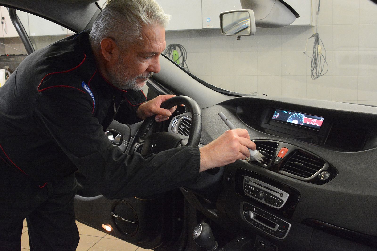 A műszerfalon az apró kis részeket különféle ecsetekkel érjük el, amik nagyon finom szőrűek és az illesztések közötti takarításra is különleges puha szerszámokat használunk.