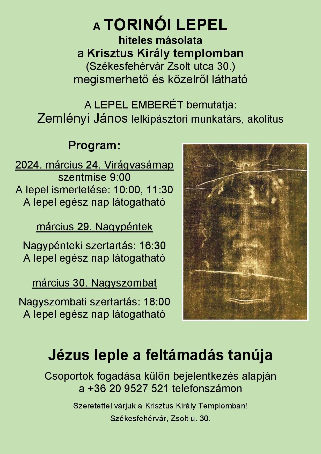 Március 24-én, virágvasárnap a Krisztus Király templomban megismerhető és közelről látható a Torinói Lepel hiteles másolata. Egész nap nyitott templomajtóval várják a látogatókat. Ezen kívül március 29-én és 30-án is lehetőség lesz a lepel megtekintésére.